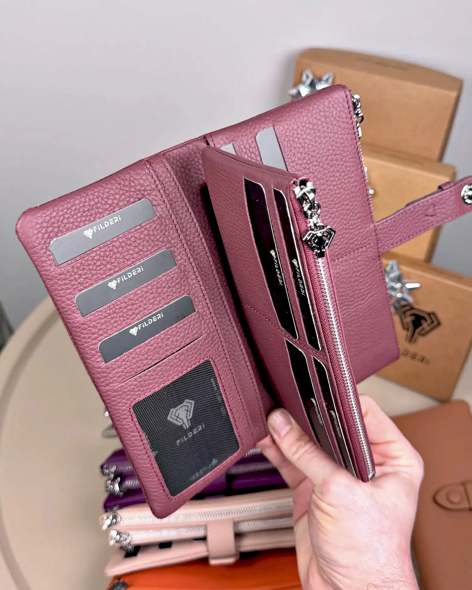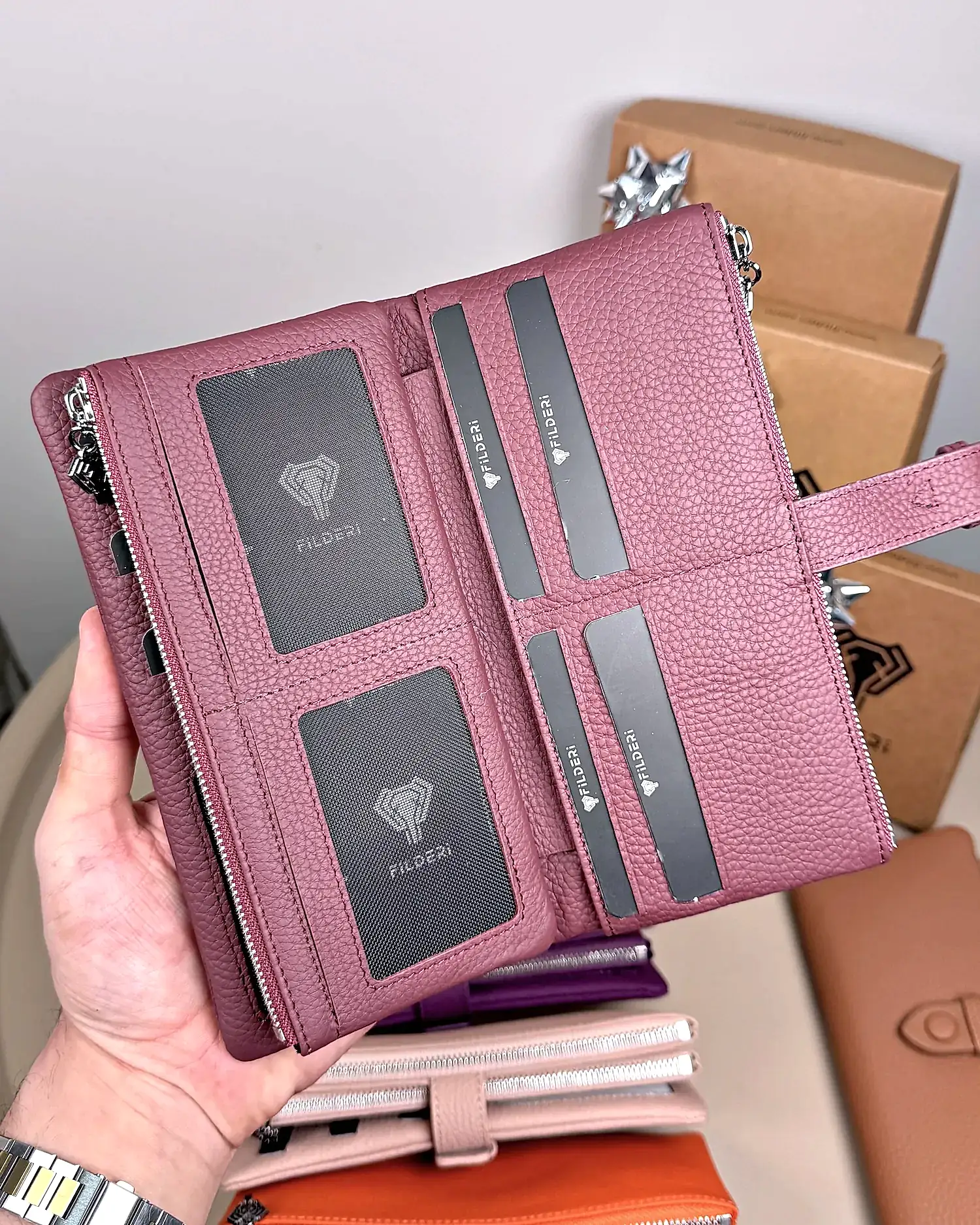 Derisi kaliteli, elde şık duruyor. Yeteri kadar kartlık gözü var, kağıt ve madeni paralar için kullanım kolay, telefon rahat sığıyor.