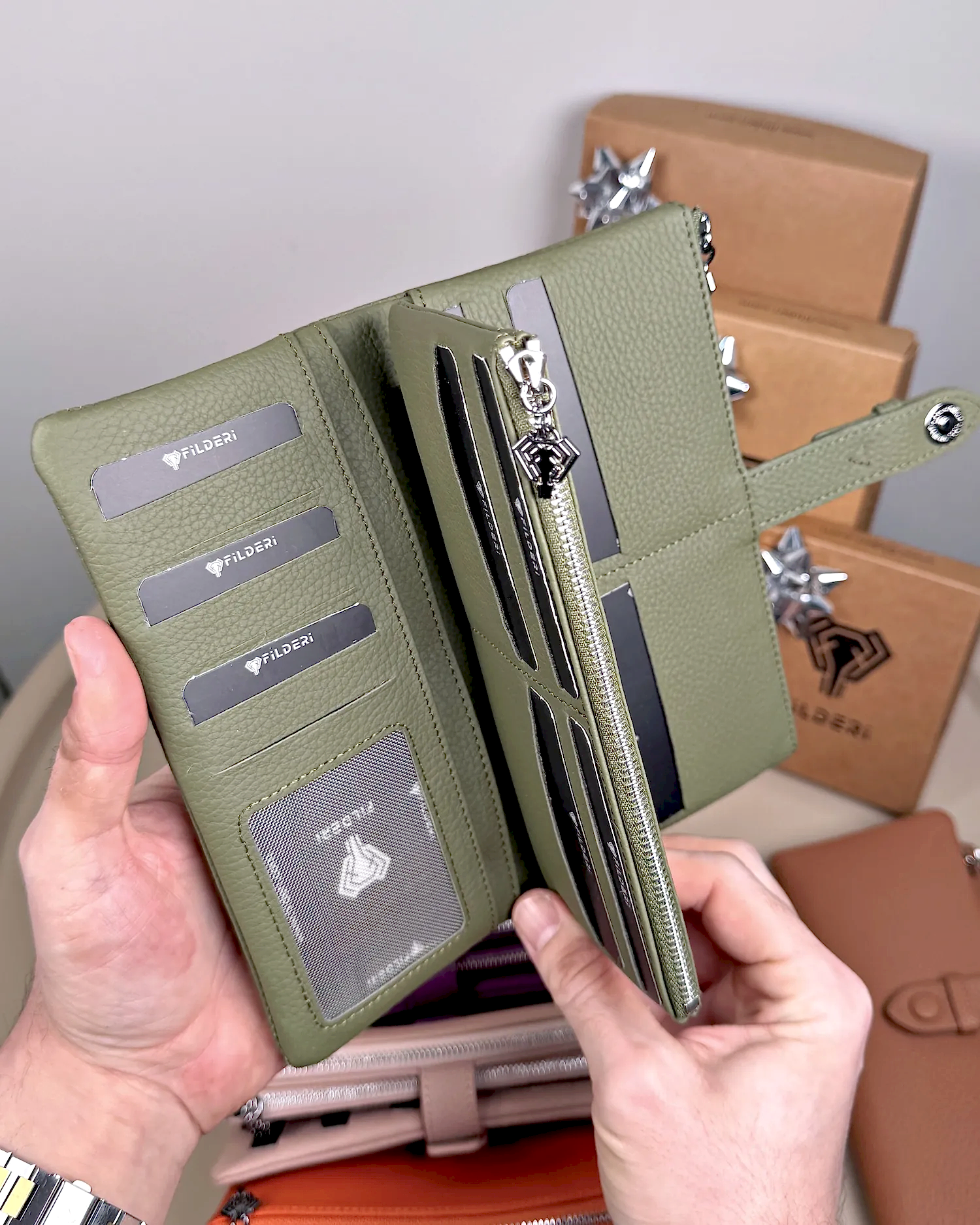 Derisi kaliteli, elde şık duruyor. Yeteri kadar kartlık gözü var, kağıt ve madeni paralar için kullanım kolay, telefon rahat sığıyor.